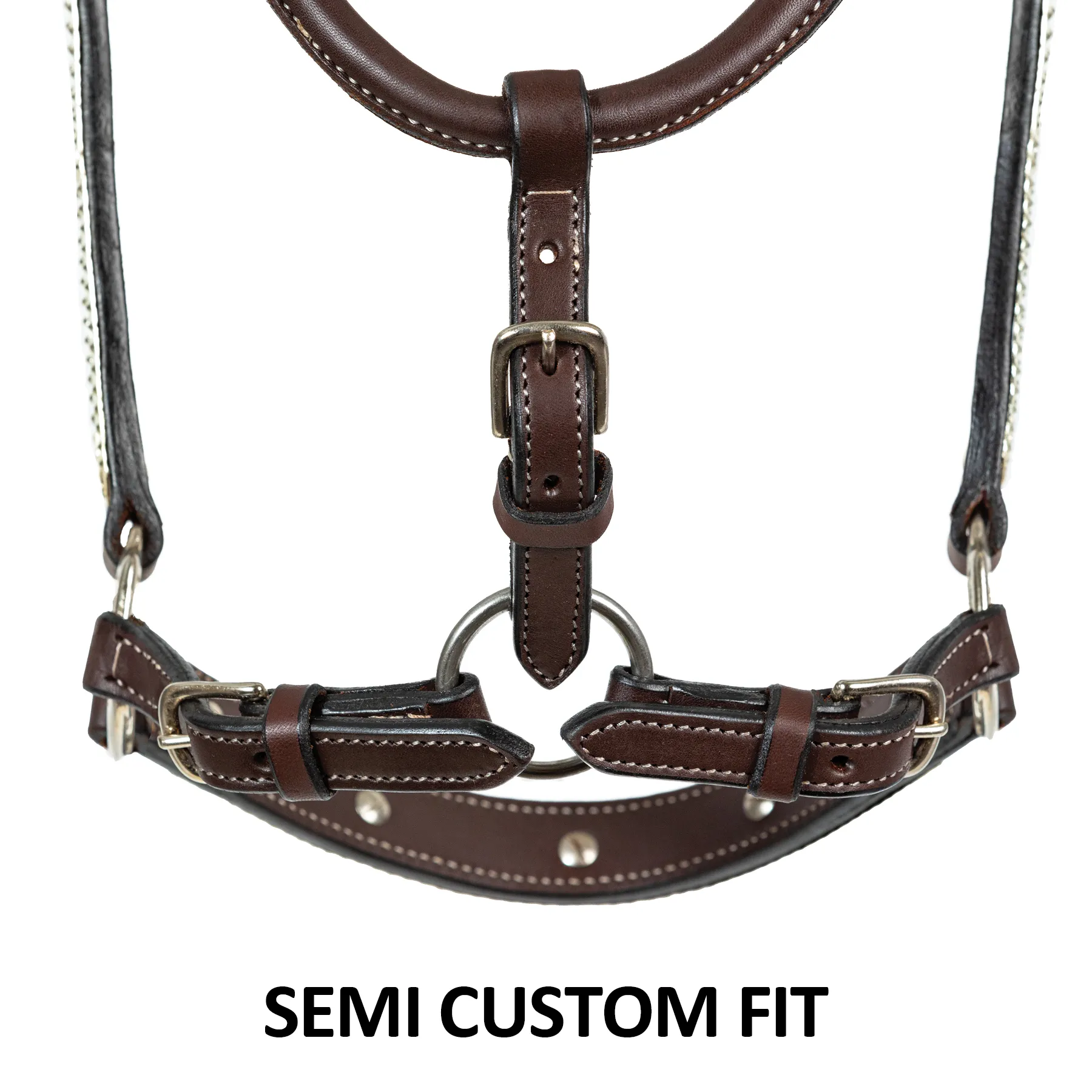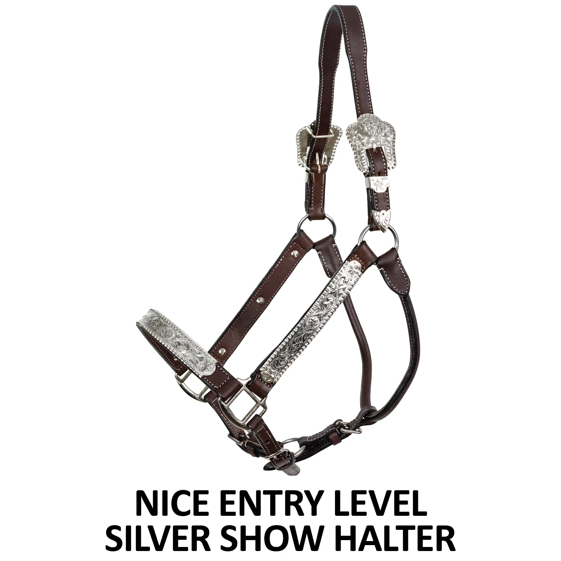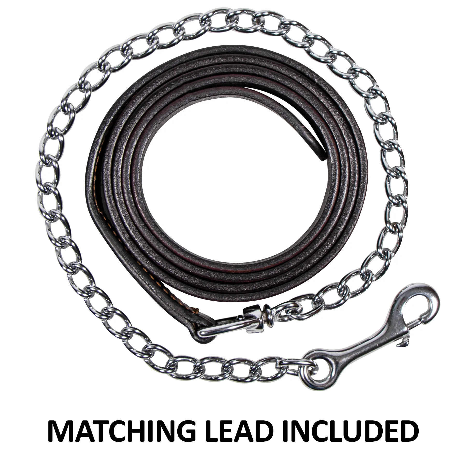 Exceptional quality for a great price make this an ideal starter show halter. Dark leather with cream accent stitching throughout for a stylish look. Silver plated cheeks, nose and buckles. Comes with a matching leather lead with a 30″ chain.