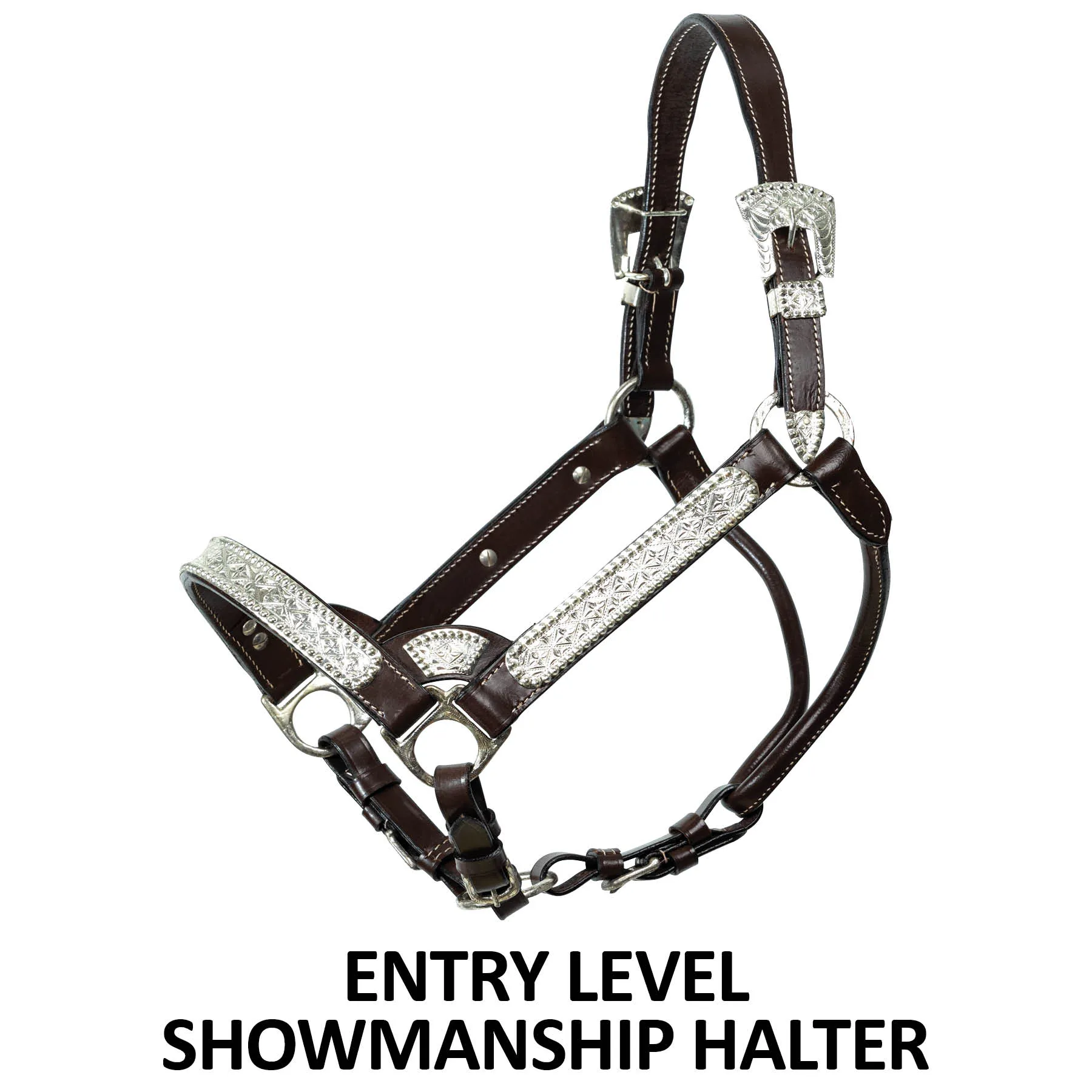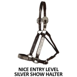 A classic-styled, entry level showmanship halter to get you started in your show career. The Double S Felicity Show Halter with Lead is made from dark oil leather with cream stitching, complimented by the full silver plate detailing on the cheeks and nose, as well as matching buckle, keeper and tip set to finish off the look.