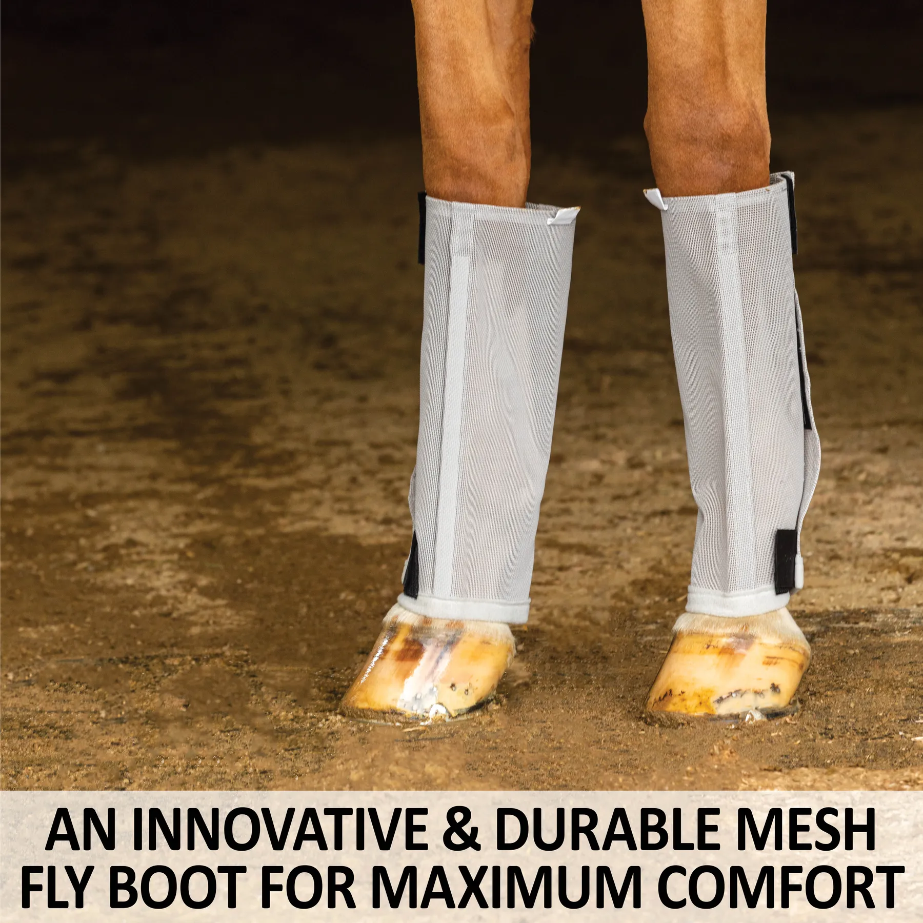 The Dura-Mesh FreeForm Fly Boots (Set of 4) is one of our more durable fly boots that offer maximum comfort and protection from bugs. The 1000D poly/vinyl mesh material protects your horse from flies, offering 70% UV protection while your horse is out in the pasture. These boots are flexible yet sturdy, with a hook and loop closure, keeping the boot upright on your horse’s leg. The improved design features thicker flexible stays so the boot doesn’t slouch and stronger velcro strength for a more secure fit. They come up higher on your horse’s leg than traditional fly boots for added protection and are tapered like a cone, adding shadowing and darkness to the horse’s leg and creating movement as they move. The added darkness inside the boot and the movement of the boots deter flies from landing on them, meaning your horse is more comfortable! Use all summer for lower leg fly protection, in the stall, or turned out.