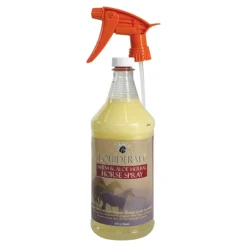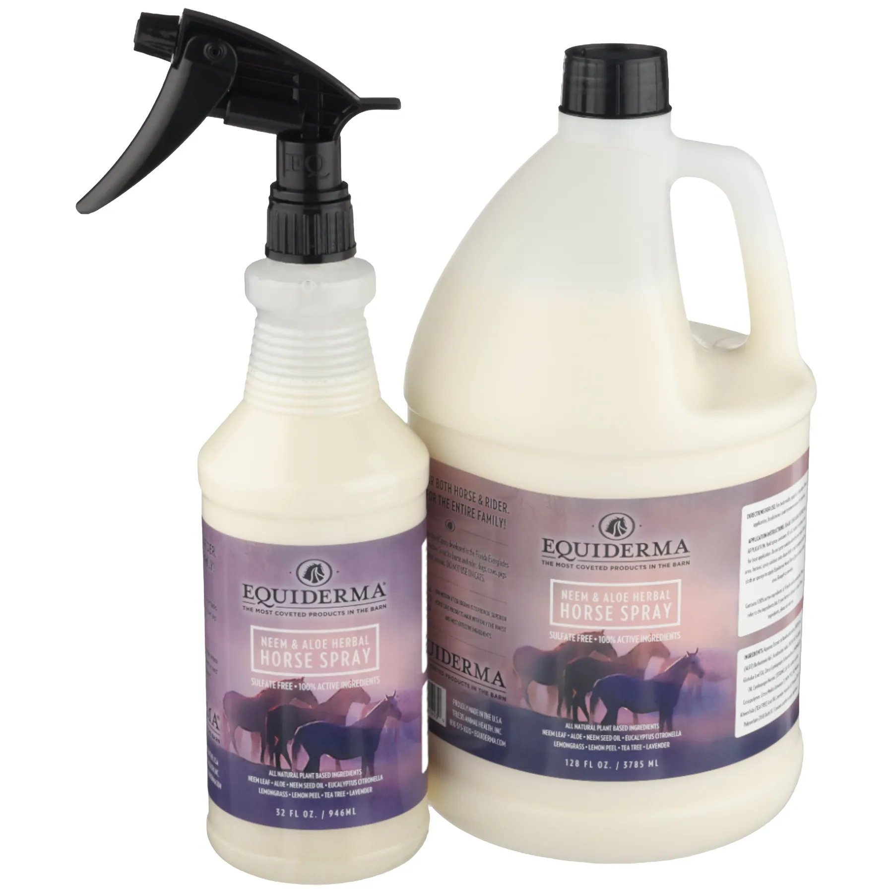 Deter flies naturally with the Equidermaâ„¢ Neem & Aloe Herbal Fly Repellent Horse Spray, available in a spray bottle or gallon refill. Made only with natural ingredients, such as neem, lemongrass, and eucalyptus, this fly spray not only smells good, but it also effectively repels flies, mosquitoes, ticks, and other biting insects. The repellent is made with certified organic ingredients, so it is safe to use for both horses and their riders and soothes most sensitive skin types. Plus, the water-based formula does not leave a sticky, oily residue.