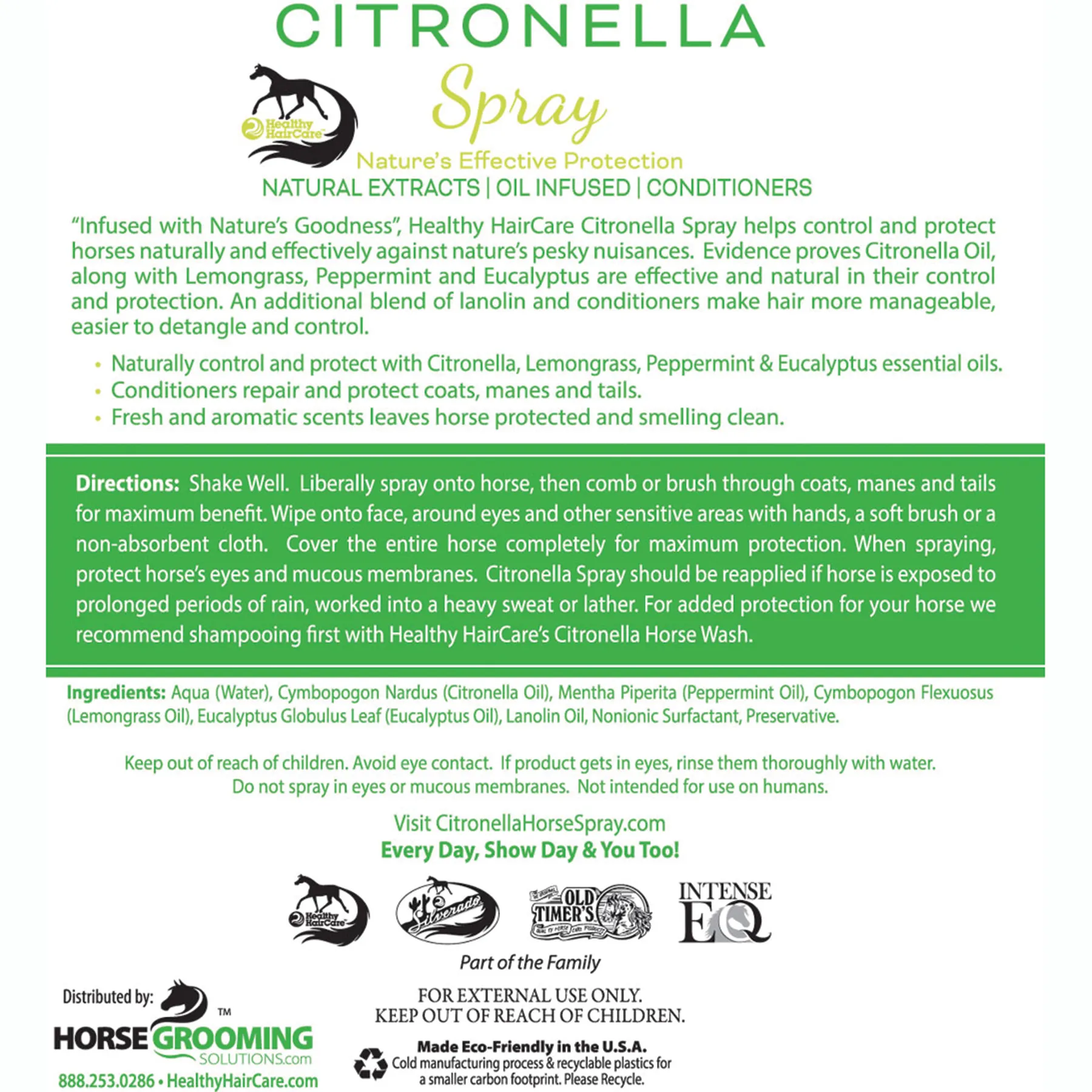 The Healthy HairCare Citronella Horse Spray is an all-natural fly repellent infused with nature’s goodness to control and protect your horse against pesky nuisances effectively. Its unique blend of Citronella Oil, Lemongrass, Peppermint, and Eucalyptus essential oils is proven effective in deterring insects while conditioning your horse’s coat and protecting them from sun damage. The formula also contains lanolin and other conditioners to help manage, add volume, and detangle your horse’s hair. This multi-purpose spray even eliminates and prevents the growth of fungus on wounds, boosts the healing of wounds, relieves spasms and gas, stimulates and improves circulation, facilitates the healing of eczema and dermatitis, and reduces pain associated with swelling or tenderness. Plus, the fresh, aromatic scent will leave your horse smelling nice and clean!