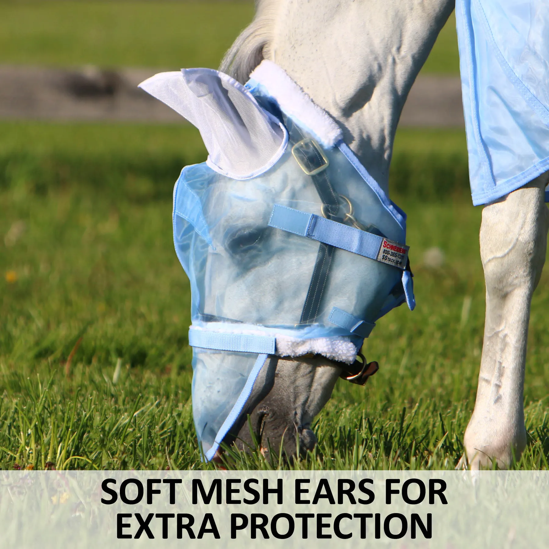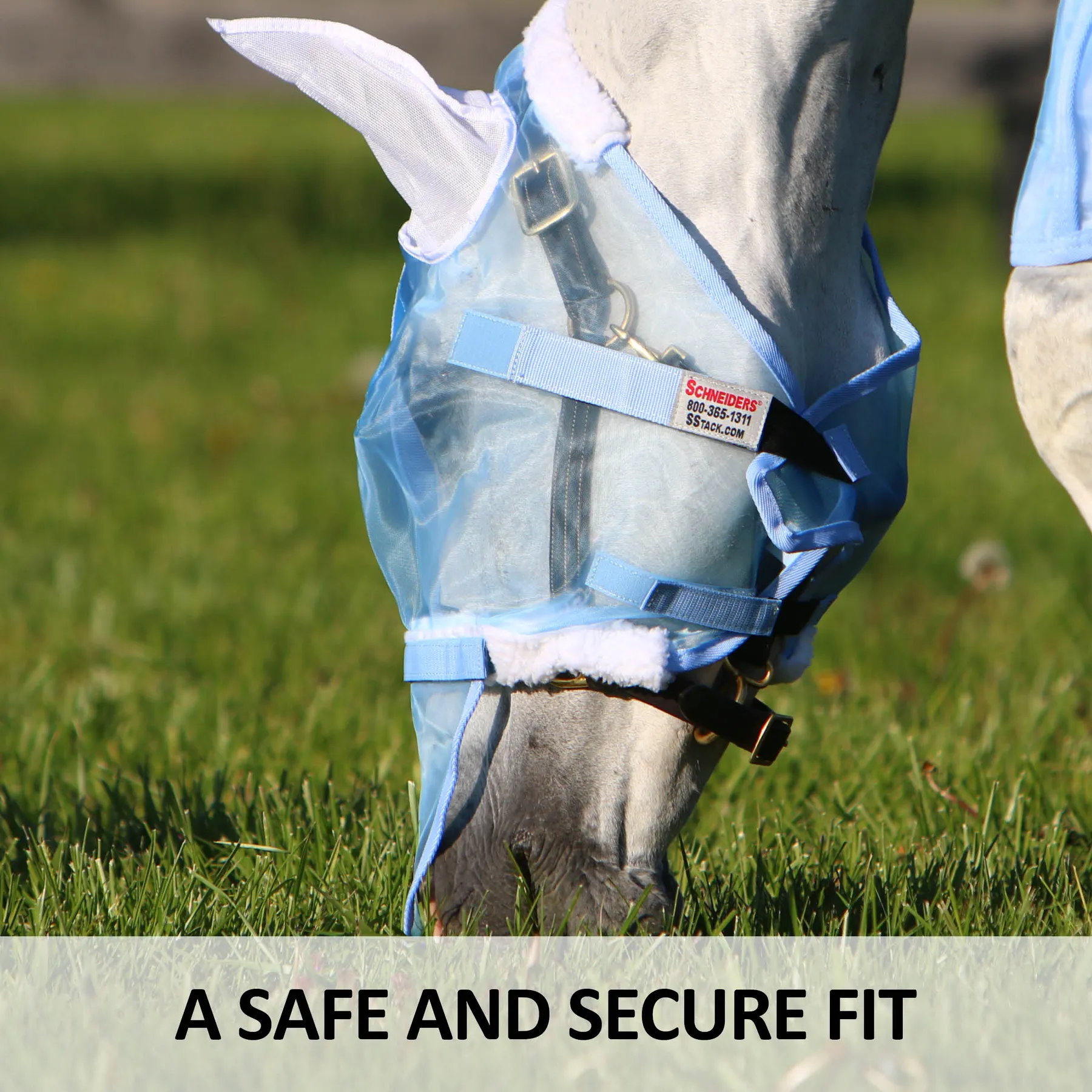 Your horse will be protected from insects from their nose to the top of their ears with the Mosquito Mesh Fly Mask with Extendable Nose. This fly mask is designed with a removable, extendable nose option that is tapered to follow the contoured shape of the muzzle for those horses that need extra coverage on their faces during turnout. The mask is constructed using a 350D extra fine “window screen” nylon mesh. It allows for the best airflow, staying cool in direct sunlight with a 60% UV protection rating, and provides an optimal shield from the smallest biting bugs, including tiny gnats. This mask is optimal for horses who live in hot, buggy climates and need a mask that will keep them from getting insect bites.