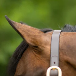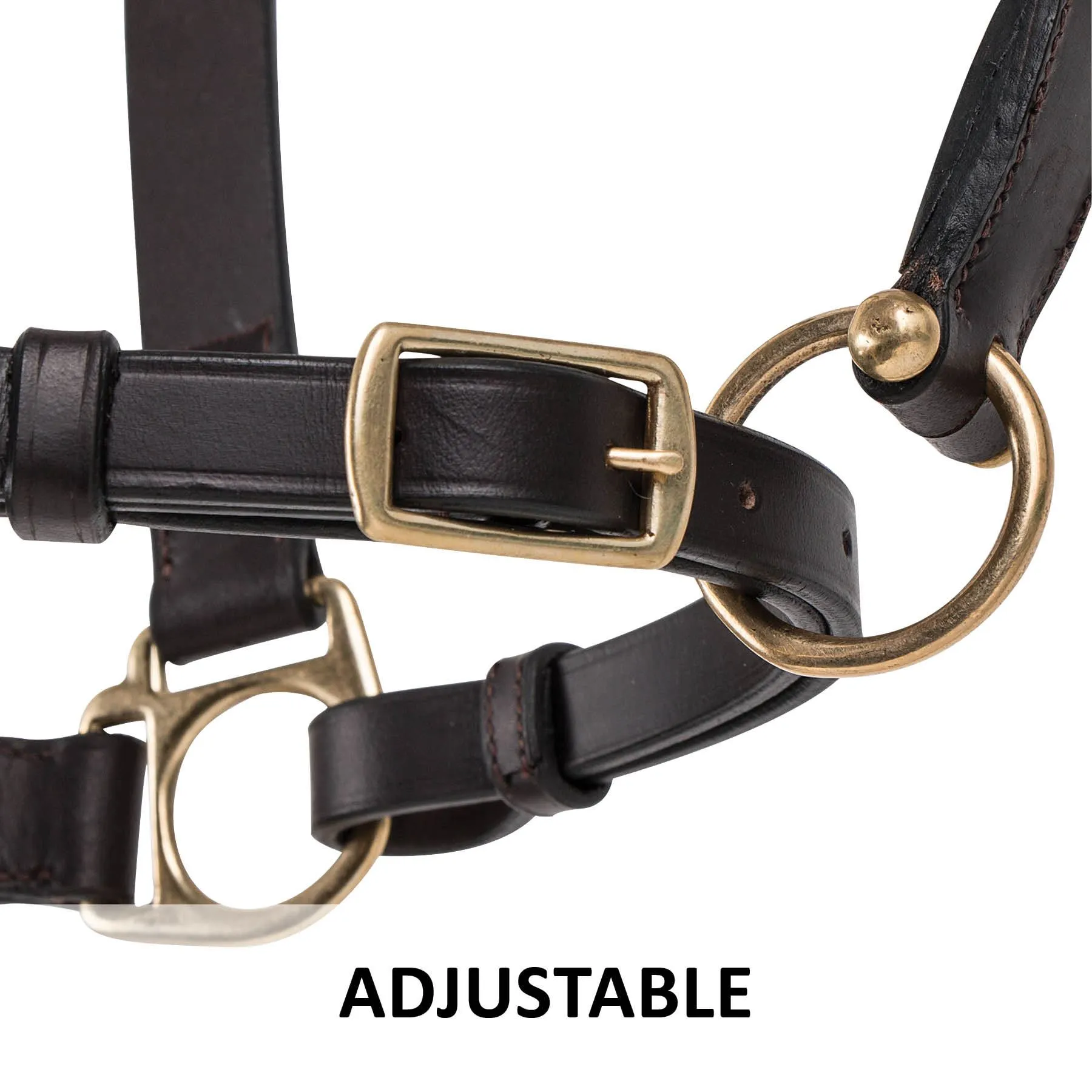 This 1″ single ply harness leather halter is reinforced at each ring, is fully adjustable and has solid brass hardware.