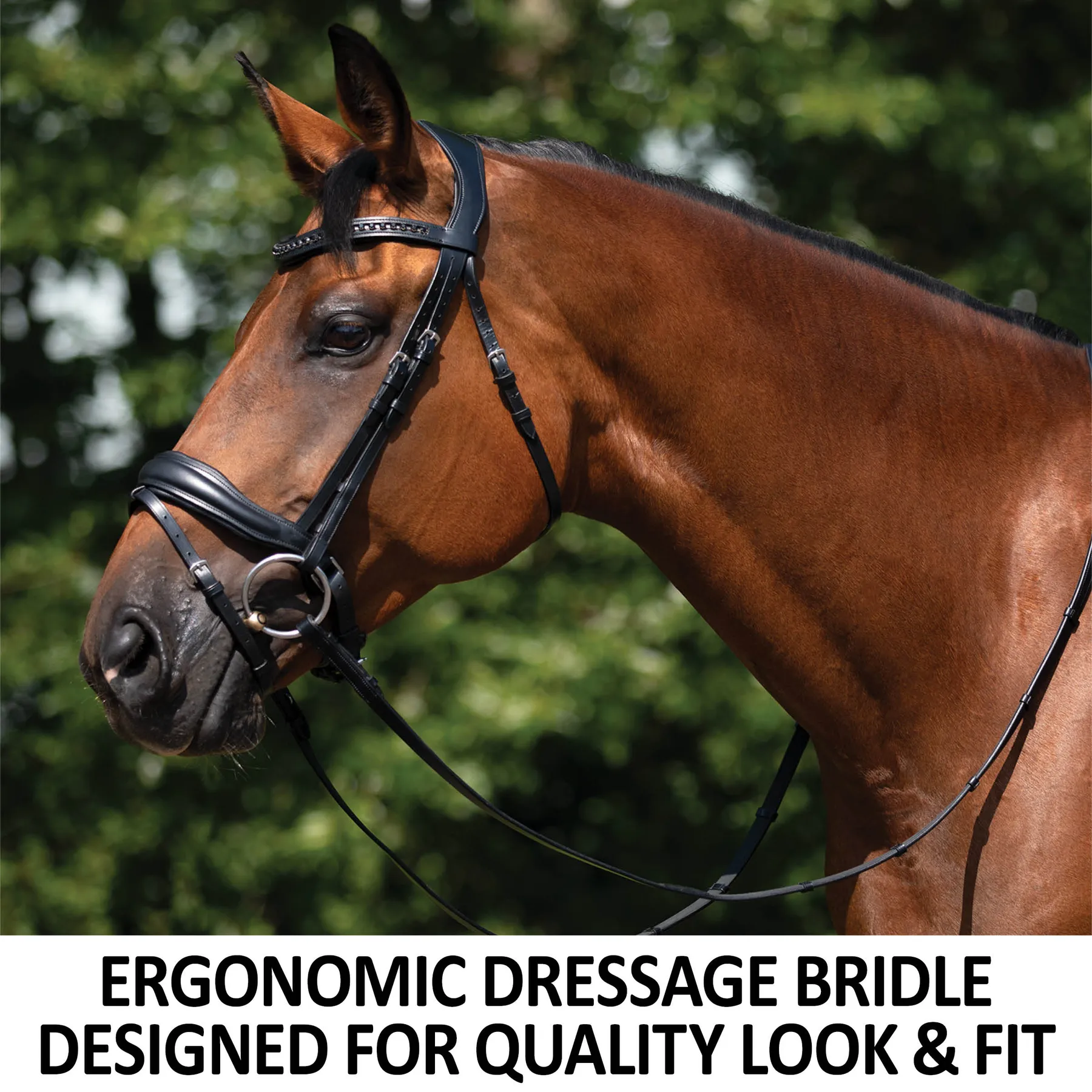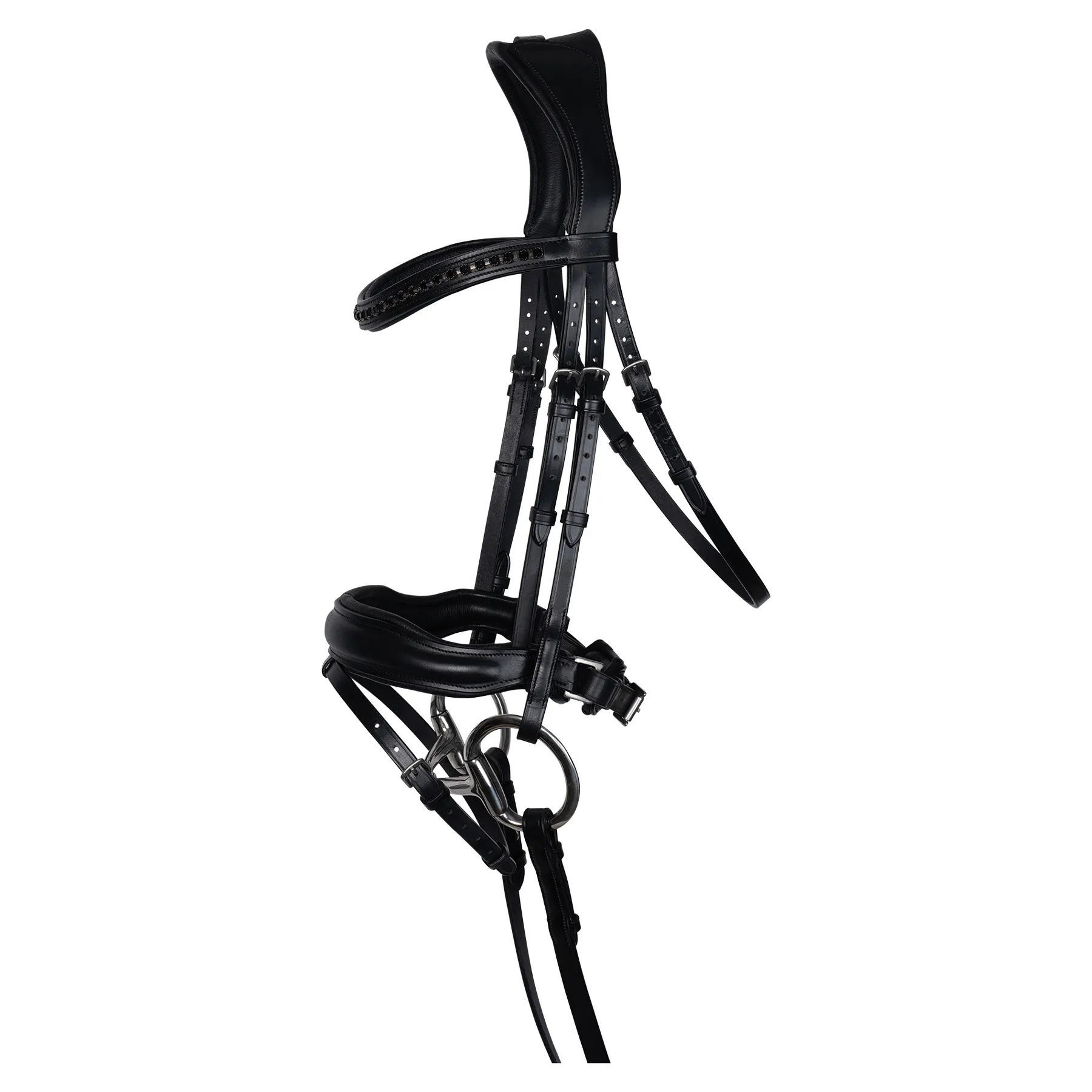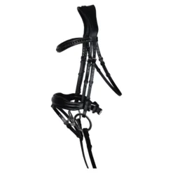 - Ergonomic black dressage bridle that features a crank noseband